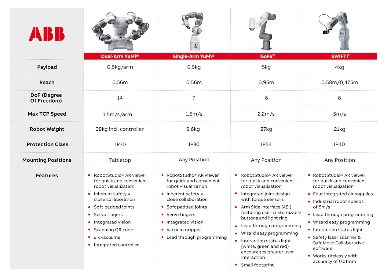 Il nuovo cobot GoFa si basa sul successo della famiglia YuMi di ABB, che ha aiutato le aziende ad automatizzare in sicurezza le attività chiave da quando YuMi, il primo robot realmente collaborativo al mondo, è stato lanciato nel 2015. Il portfolio di robot collaborativi di ABB offre ora tre diverse famiglie, YuMi, GoFa e SWIFTI, con opzioni di capacità di carico che vanno da meno di 0,5 kg a 5 kg, per supportare la più vasta gamma di applicazioni collaborative.