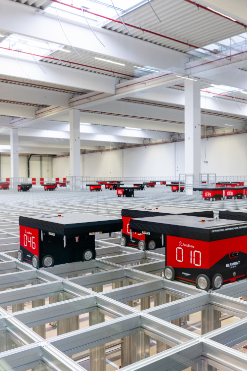 Il polo si estende su circa 15.000 metri quadrati ed è configurato con circa 75.000 cassette (604x404x330 mm) impilate su 18 livelli, per un’altezza complessiva di circa 8 metri. La movimentazione automatizzata è affidata a 85 robot R5 Pro che operano sulla superficie della griglia assicurando rapidità di prelievo, precisione e continuità operativa.