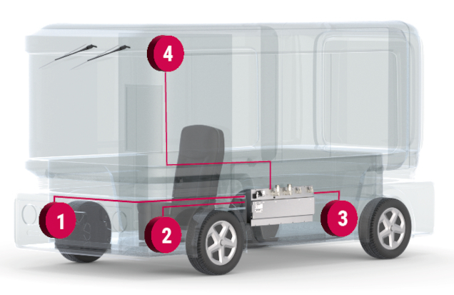 Immagine: KEB Automation. Il T6 APD può essere utilizzato in un bus per le seguenti unità: 1 – Compressore d’aria, 2 – Pompa del servosterzo, 3 – Raffreddamento della batteria, 4 – Aria condizionata